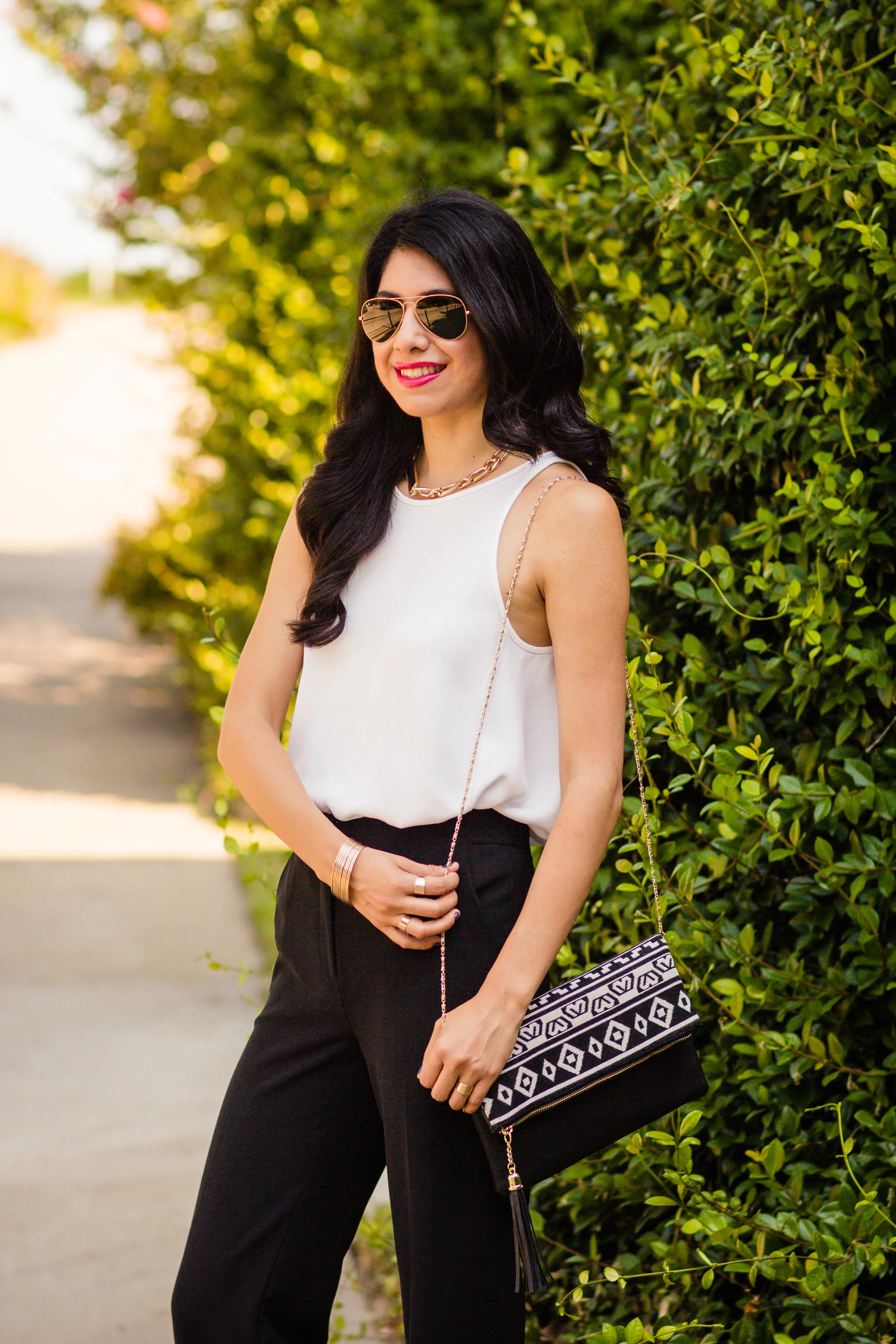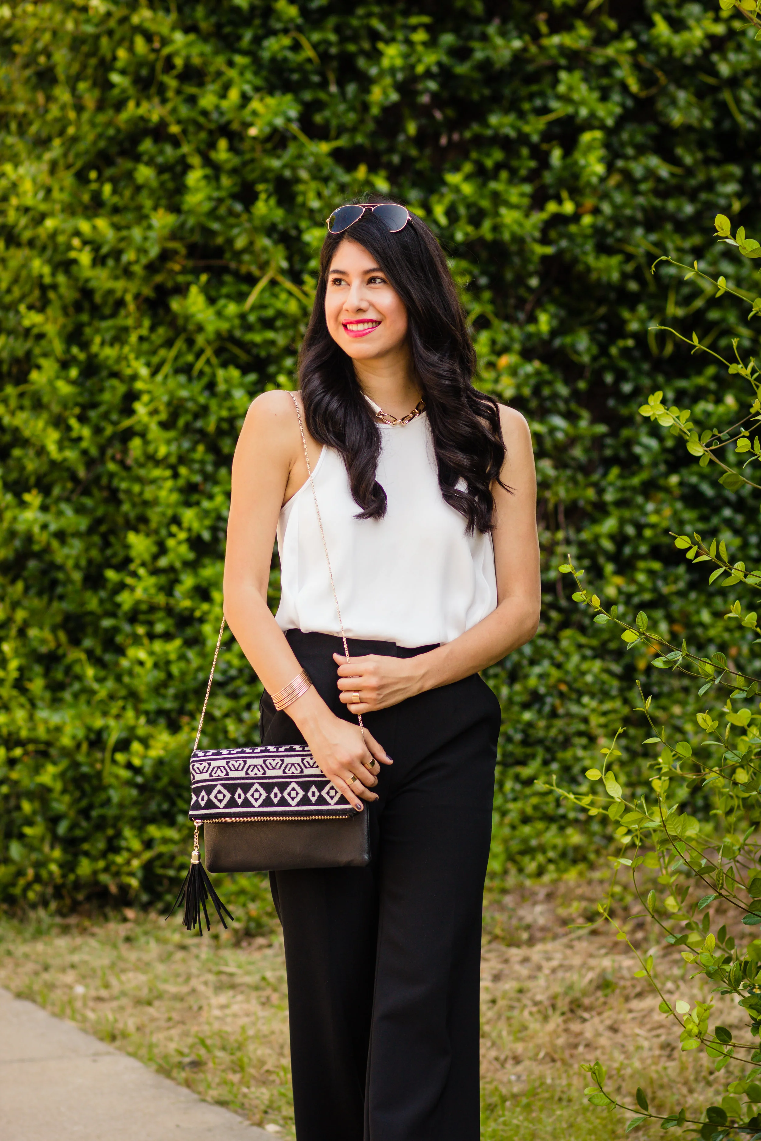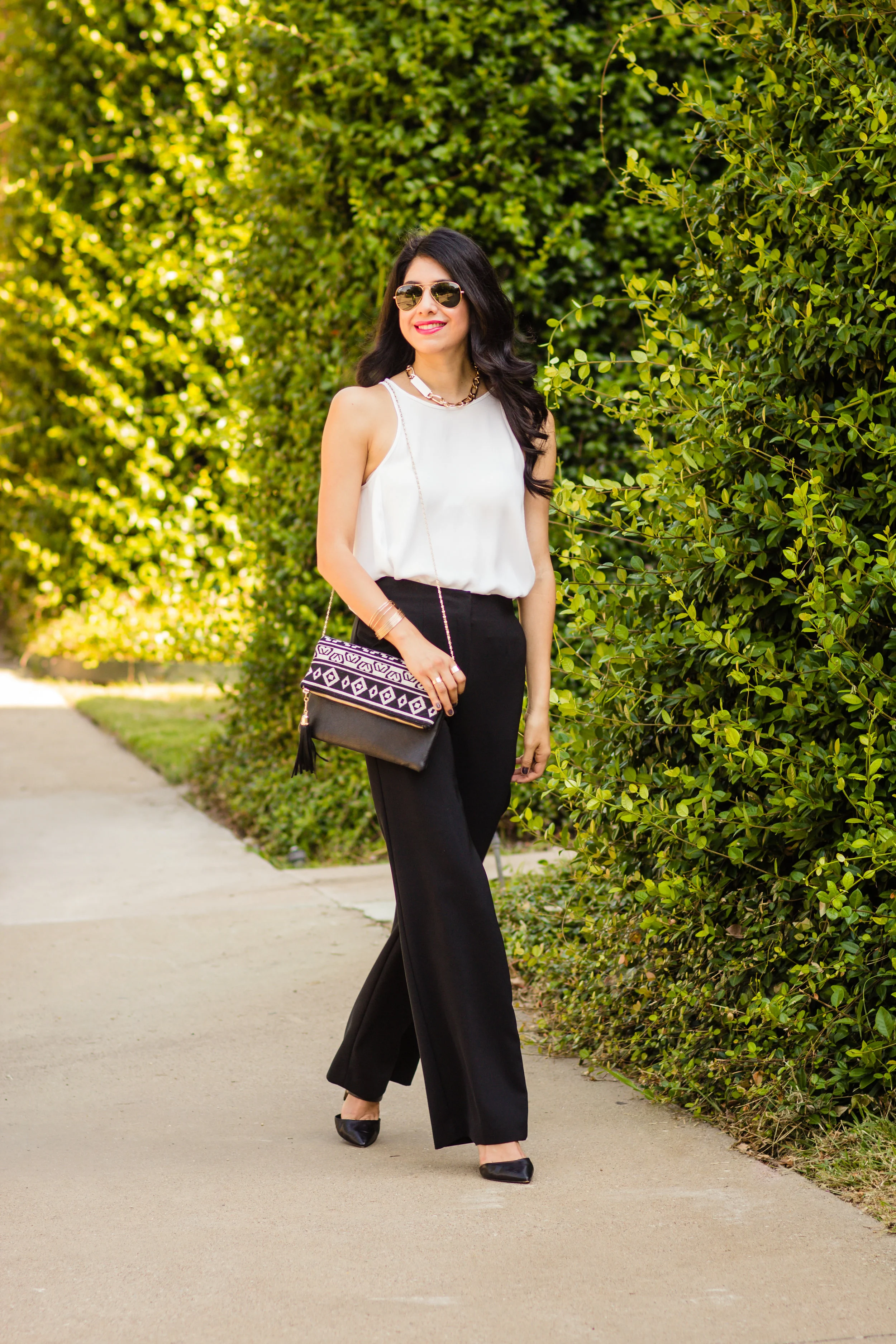If you are bold, I would try a crop top to go with these wide leg pants! If not, a racer back like the one I'm wearing is great for going out. However I would probably switch to open toe shoes versus closed toe. They are more fun for a night out! I also recommend wearing color such as a bright blue, or red with a feminine or cut out top (i.e. cold shoulder tops).