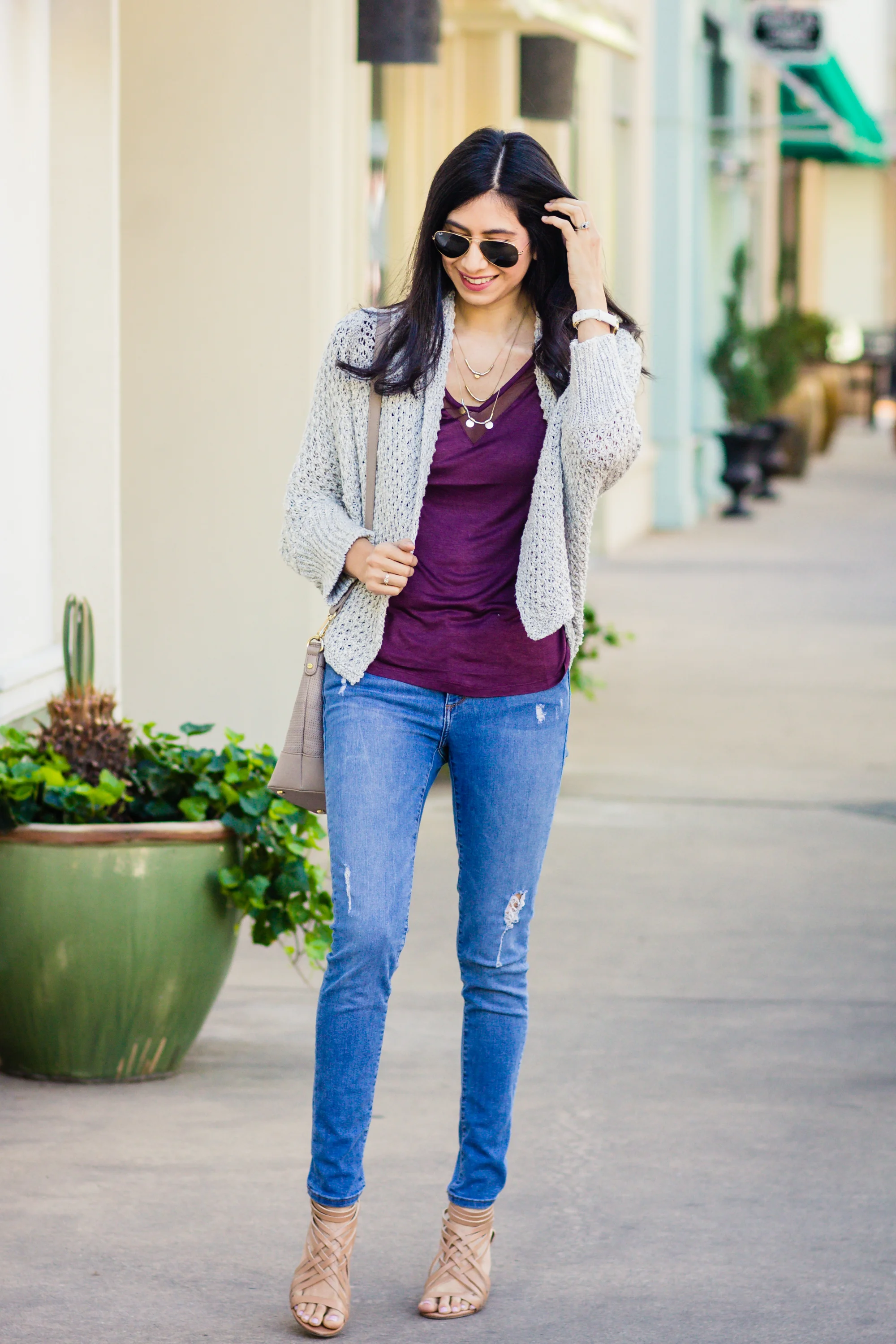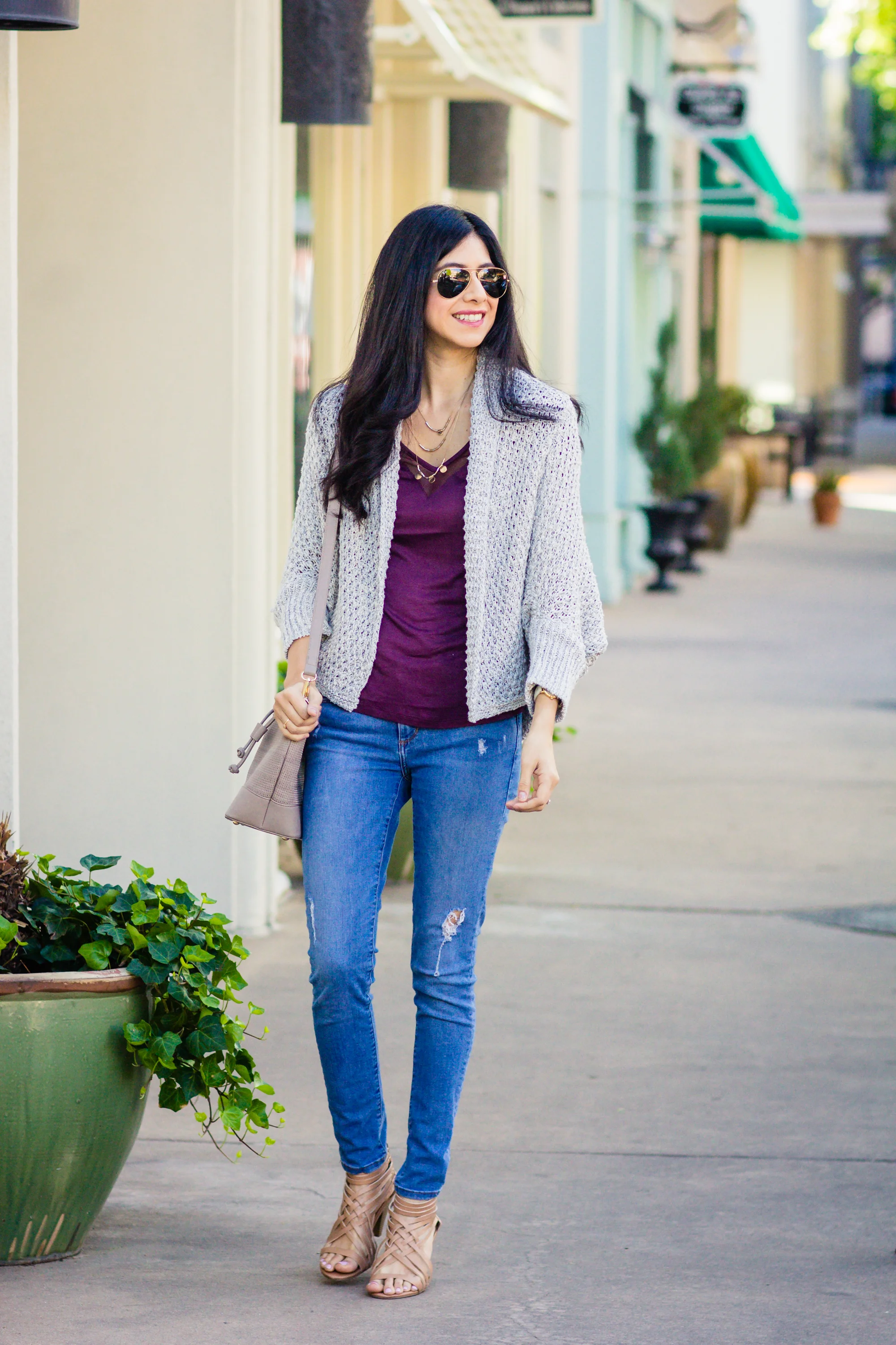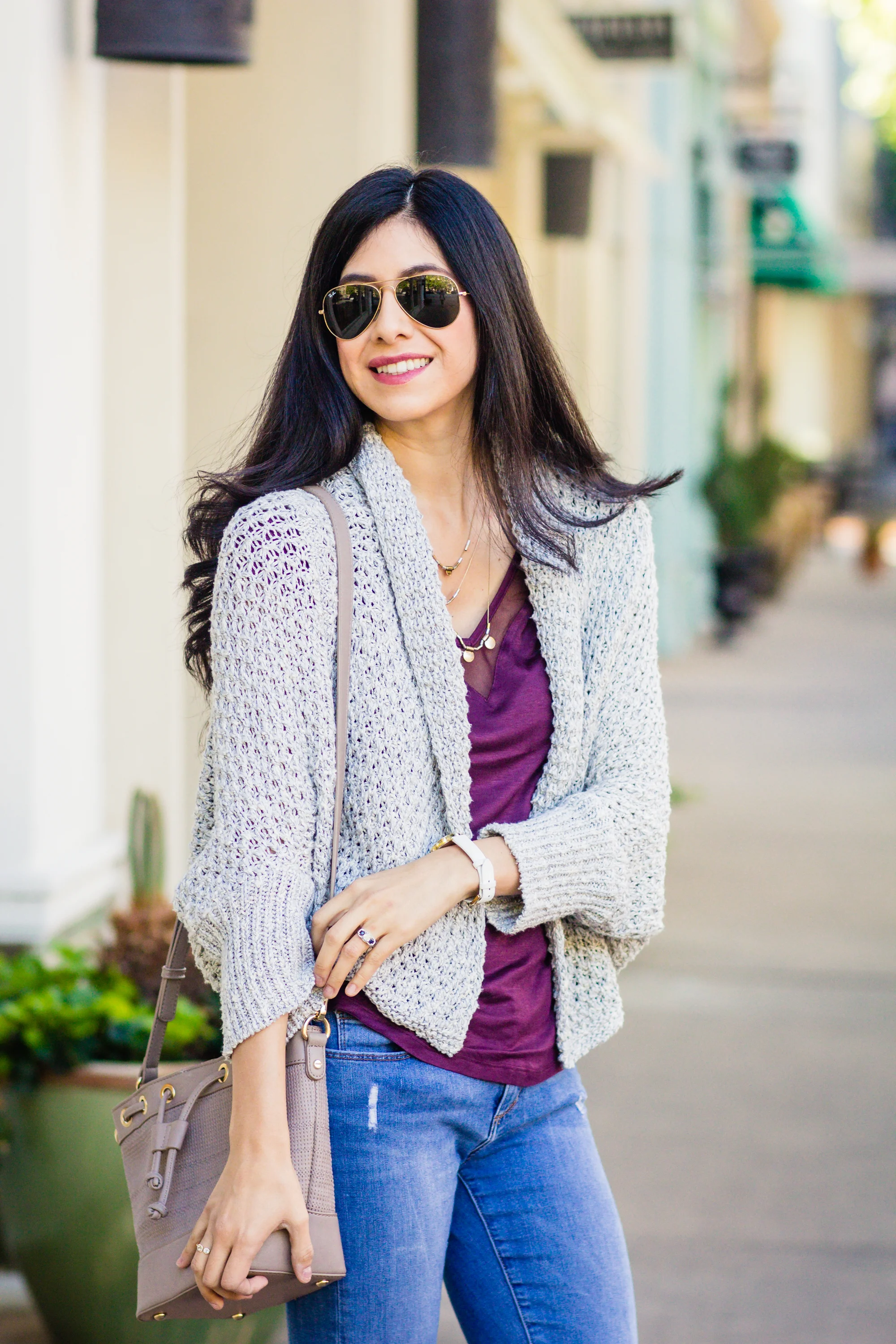While I am ready to bust out with short sleeve or sleeveless tops, I still find myself wearing sweaters. The weather has been beautiful! And if your like me who wears sweaters year round, this temperature is PERFECT! So, is it too late to wear a sweater in the Spring ? Not at all! I decided to style this knit sweater with a basic burgundy top. This sweater is perfect for Spring because the sleeves are not long, and the woven texture allows for the cardigan to remain breathable.