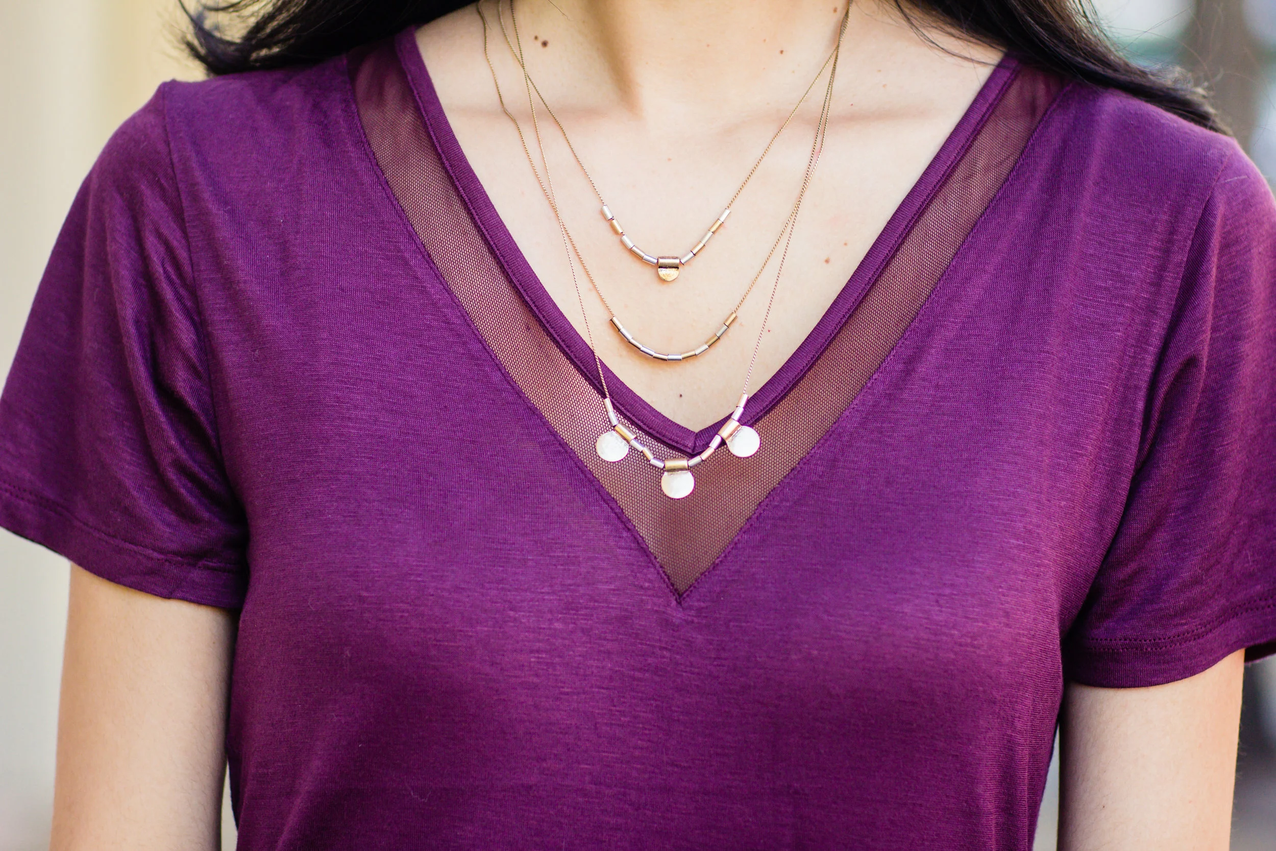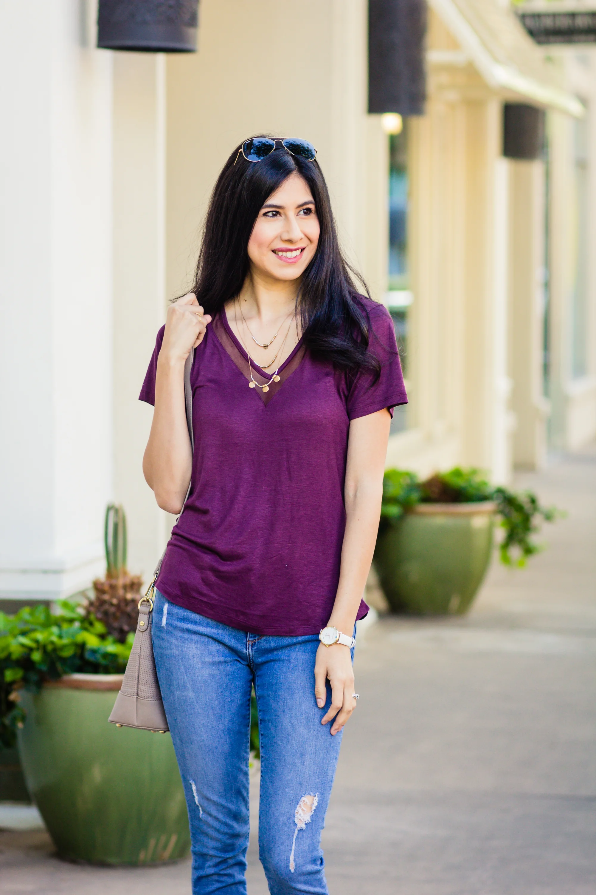 I love how this is not just your basic tee! The mesh lining around the collar adds a chic and classy detailing to this top. It's great to wear out on a casual day, or dress it up over black jeans and heels for a night out!